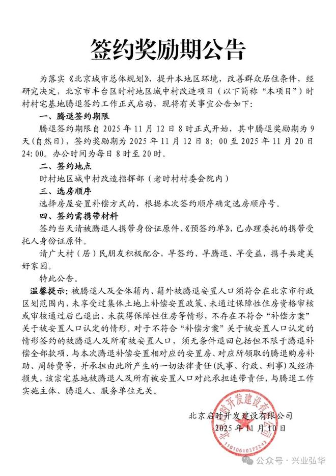各位亲: 丰台区时村地区城中村改造项目时村村宅基地腾退签约时间定了,明起2025年11月12日8时正式开始。签约